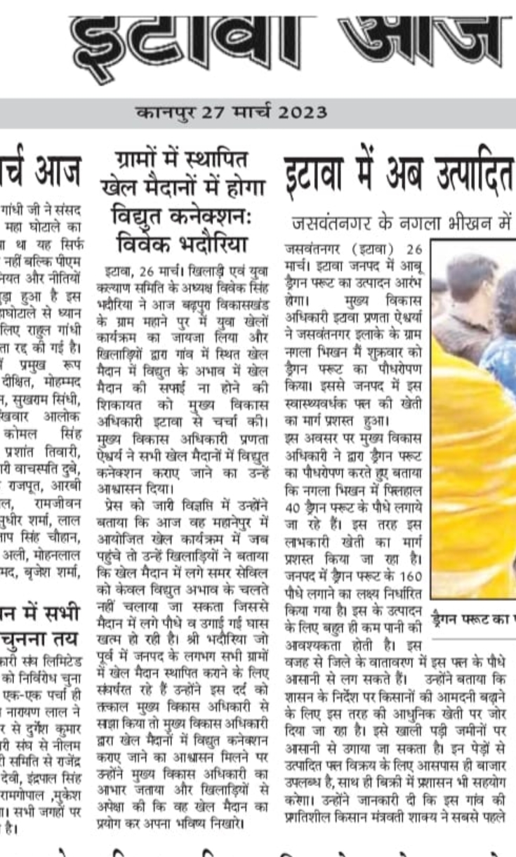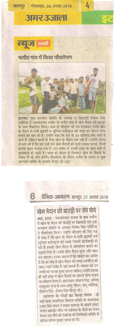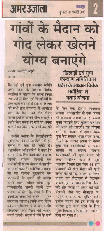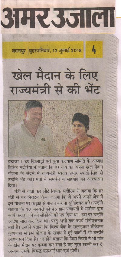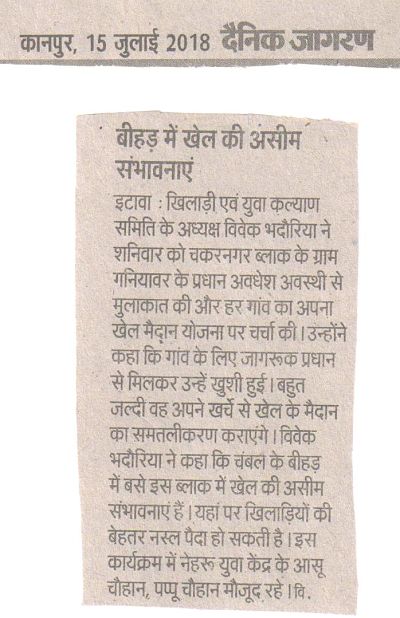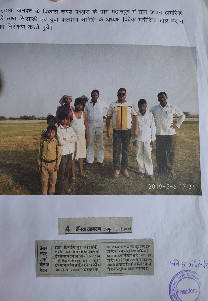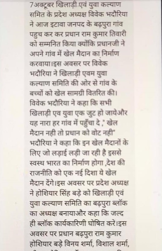 खिलाडी एवम युवा कल्याण समिति के प्रदेश अध्यक्ष विवेक भदौरिया ने इटावा जनपद के ग्राम बढ़पुरा जाकर गांव के प्रधान को खेल मैदान बनवाने पर सम्मानित किया ।और गांव के बच्चों को खेल सामग्री वितरित की।